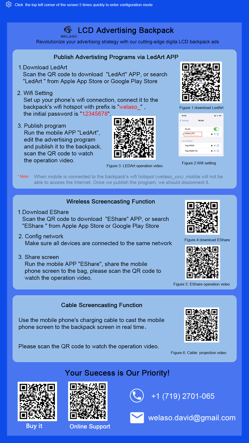 When you receive this LCD backpack, we need to download and install two Apps,One is the “LedArt” App, which is used to publish advertising programs.The other is the "EShare" APP for real-time wireless sharing of smartphone/ipad screen to LCD backpack.